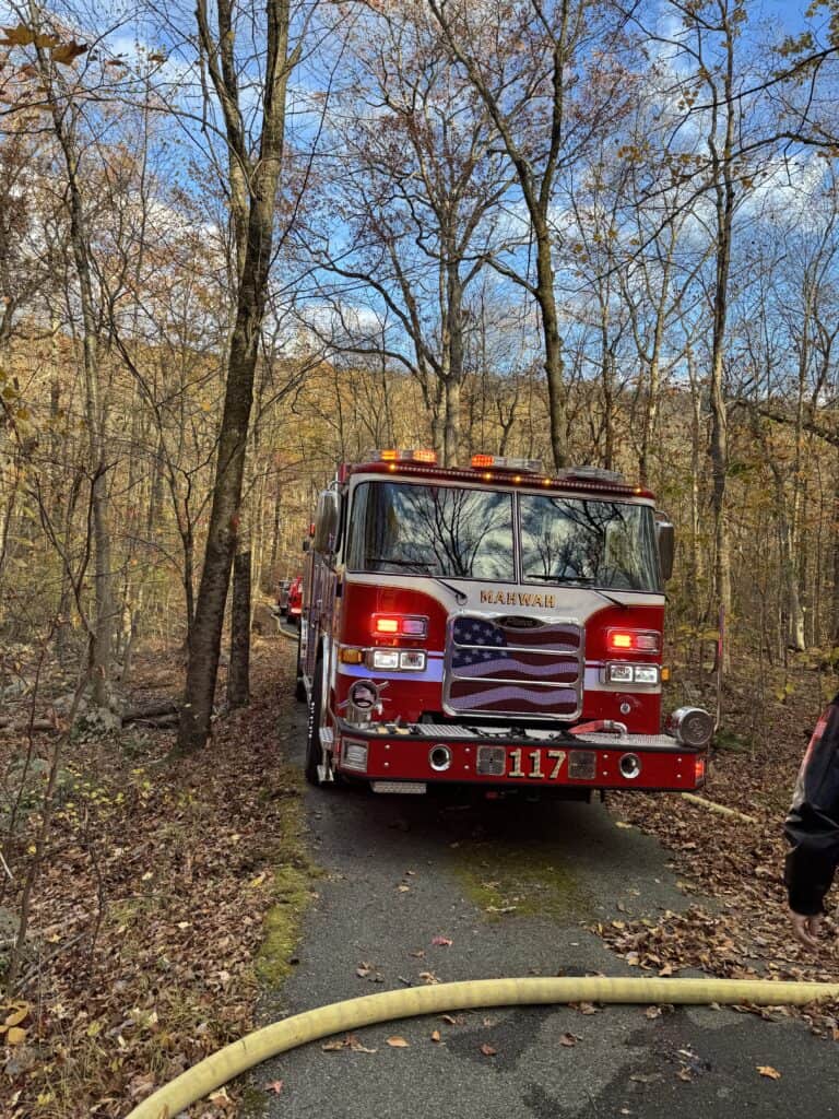 First arriving units found a large brush fire in a heavily wooded area. First due Rescue Engine 117 left a supply line in the street and proceeded down a long driveway to the incident and began extinguishing the fire with MP-2. Engine 115 arrived shortly after and supplied 117’s lines. Additional manpower was requested from Fire Company 3 to assist at the scene, as well as Mawhwah PD’s drone.