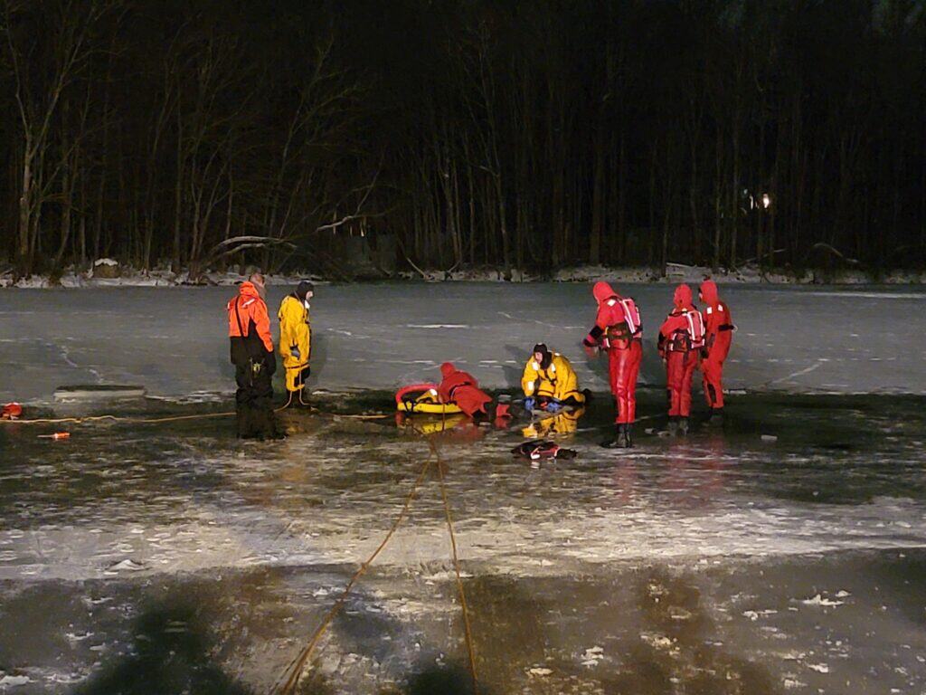 Firefighters rotated through scenarios as both victims and rescuers entering the frigid water practicing proper techniques for victim approach and extraction of victims who have fallen through the ice. This specialized training ensures our crews remain proficient with our ice rescue equipment and procedures during the winter months when these incidents occur.