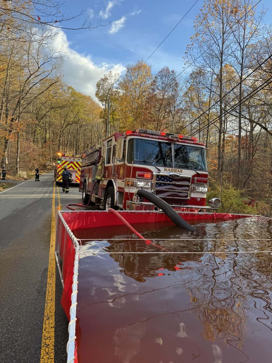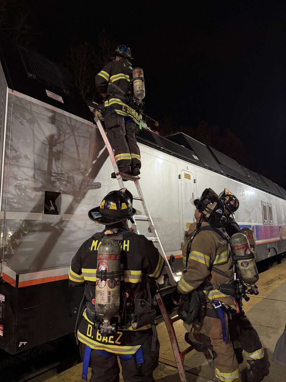Yesterday evening, Fire Companies 1, 2, and 3 were dispatched to the Mahwah Train Station for a reported train on fire. Upon arrival, Rescue Engine 117’s crew made contact with the train crew, who had already shut down the locomotive and evacuated passengers to the platform. After gathering information about the reported fire location, E-117’s crew used a ground ladder to access the roof of the train and conducted a thorough inspection. Simultaneously, Rescue 1’s crew evaluated the locomotive’s exterior and mechanical spaces. E-115 & RS-1 arrived ready to supply water & manpower if necessary. After determining there was no active fire or hazardous conditions, Engine 117 remained on scene with the train crew while awaiting the arrival of New Jersey Transit mechanics. Approximately one hour later, the scene was turned over to NJ Transit and all fire units returned to quarters.